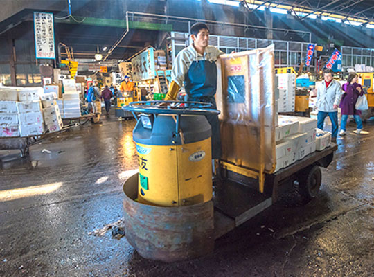 三菱物捷仕專為水產交易市場設計的電動搬運車:HT10-70專門水產品交易市場使用車型, 簡便小巧,適合水產市場狹小的空間,車體后面拖板的設計,可以增加運貨的數量,并可以在車體后連接更多平板車。 該車型在日本東京筑地魚市得到廣泛使用,公認的水產市場專用叉車。